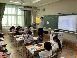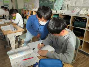 5年生の教室では、算数科の授業で、円柱と角柱の図を書く学習に集中して取り組んでいました。手が止まると自然に教え合う姿が見られました。その様子から、学び合いが定着していることを実感しました。