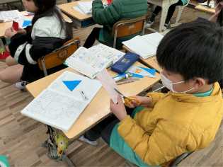 そんな寒さ厳しい一日でしたが、3年生の教室では、算数科の授業で、折り紙を使って二等辺三角形や正方形をつくる学習に夢中になって取り組んでいました。