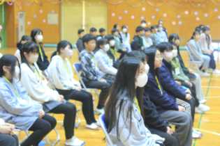 今週から3月となり、卒業式に向けて、ホールで練習し始めました。体育館の卒業生席の並びで座り、昨年度の卒業式の動画を見ながら、動きを確認しました。実際に動いてみることから練習が始まりました。 |
