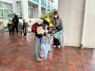 今日はあいにくの天候でしたが、登校した1年生に傘のしまい方を優しく教えている6年生の姿が多く見られました。