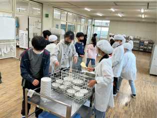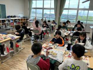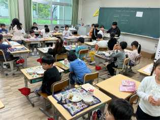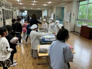 小学校で初めの給食です。給食当番になった子は、これくらいかなと、量を気にしながら、配膳しました。みんなで食べる給食はおいしいね。