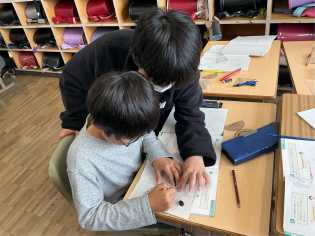 話し合ったり、教え合ったりしながら集中して学習にも取り組んでいます。さすがは最高学年! |