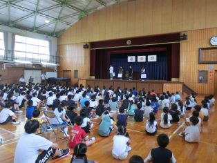 7月19日(金) 【夏休み前集会】 明日から始まる夏休みに向けて集会を開きました。士別市を訪問する4名の児童が抱負を語ってくれました。 よい夏休みを! |