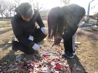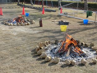 | 12月11日(木) 6年生の野焼き 前日から準備をしていただきました。ラーニングデーの時に作成し、しっかりと乾燥させた土器を野焼きしました。炎に熱せられて赤みがかかった素敵な土器に仕上がりました。 |