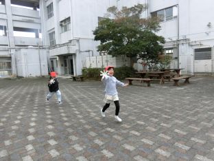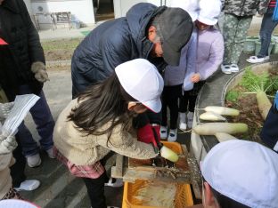 | 1月23日(金) 中庭で 中庭で、1年生の楽しみながら活動する姿が見られました。風の車を使って遊ぶ姿。そして、育てた大根を切干し大根にしました。できあがりが楽しみです。 |