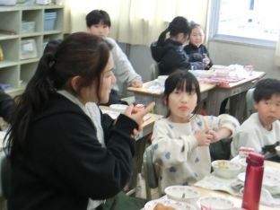 | 1月29日(木) 給食センターから 給食センターの職員の方が来校され、配膳の様子を見学されたり、一緒に給食を食べてたりしていただきました。子どもたちからは、たくさんの質問や「こんな給食が食べたい」というリクエストが出ていました。 |