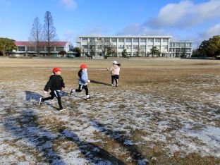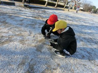 | 1月30日(金) 雪玉つくれるかな うっすらと白くなった運動場を見て、1年生が駆け出しました。雪を集めてできた小さな雪玉。積み重ねて雪玉にしたり、投げ合って遊んだりして、「冬」を楽しみました。 |
