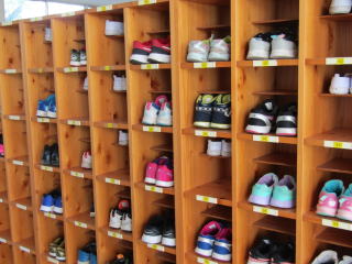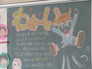 | 分散登校の2日目。Bグループの子どもたちが通学班担当の教員とともに元気に登校しました。色とりどりの靴が並ぶ下足箱を見ると、改めて子どもたちの存在の大きさを実感します。 どの学級も、黒板には担任の先生からの温かいメッセージが。教室に入った子どもたちは、目を輝かせながらメッセージに見入っていました。 |