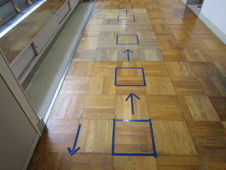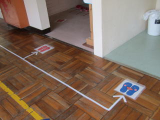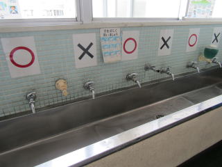 | 本日も分散登校です。6月1日より通常の学校生活が再開です。 子どもたちが使用する手洗い場・トイレには3密を避けるため、各種掲示物やビニルテープで表示をしています。子どもたちが安心して学校生活を送れるよう配慮に努めています。 |