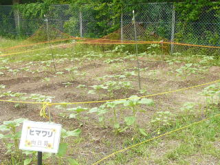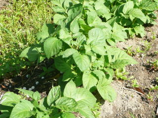| 3年生が、理科で学習するモンシロチョウの幼虫も元気にキャベツの葉を食べています。 6年生のジャガイモも大きく葉を広げ、元気に光合成しています。 |