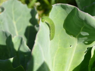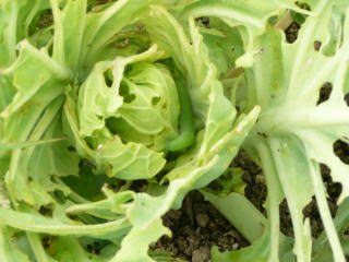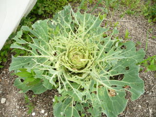 | 3年生のキャベツが、穴だらけになってしまいました。はらぺこのアオムシ君が、モリモリと食べた結果です。 ここで問題です。なんで「アオムシ」は、緑色をしているのに「あお」むしというのでしょう。 わからないと、チコちゃんに叱られますよ。 |