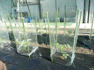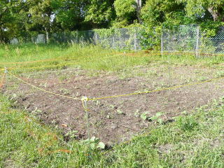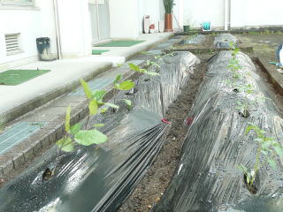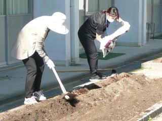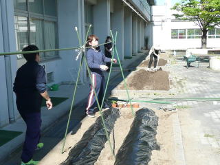 | 低学年の先生が、野菜を植えるために、中庭の畑で畝を作っています。マルチをかけ足り、支柱を立てたり。 今年はどんな野菜を育てるか楽しみですね。 1,2年生は、今年もさんさんの里で、サツマイモを育てます。 |