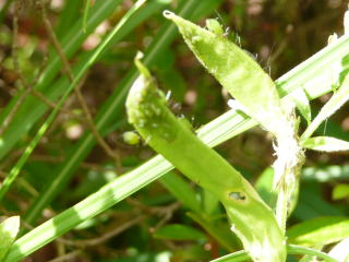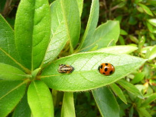 | 1,2年生の生活科と3年生の理科の学習です。 職員室前にあるツツジの葉の上で見つけました。ナナホシテントウが、さなぎから羽化したところです。ツツジの合間からカラスノエンドウが伸びてきて、たくさんのアブラムシがついています。テントウムシにとっては、ごちそうがいっぱいですね。 3年生の皆さんに問題です。テントウムシの足は、何本あるでしょう?テントウムシを見つけたら、裏返してみましょう。 |
