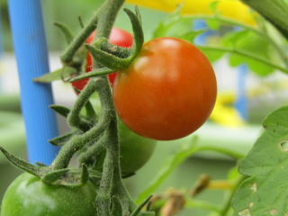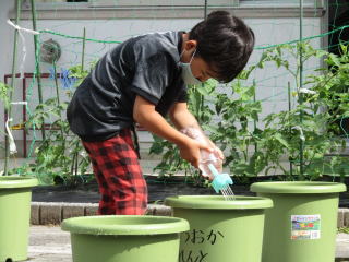 | 梅雨の晴れ間。ふと、1・2年生の菜園に目をやると、葉の間から夏野菜がしっかりと育っている様子が見てとれます。 季節は移ろいで、着実に夏に向かっていることが分かります。 |