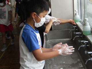 | 分散登校を経て、いよいよ今日から全員登校の日がスタートしました。友達の顔を見て、思わず笑顔がこぼれる子どもたち。休憩時間になると、待っていたとばかりに運動場へ出て、思いっきりボールを追いかける姿があちらこちらで見かけられました。 遊んだ後は、しっかり手洗い。ようやく普段の学校生活が戻ってきました。 |