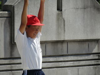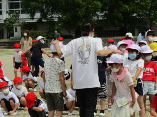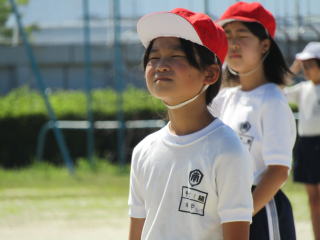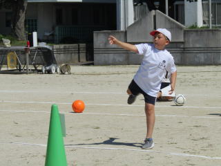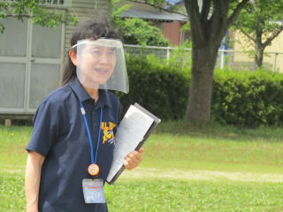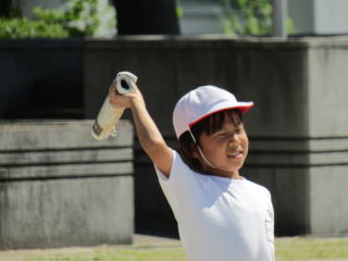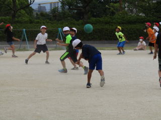 | 貴重な梅雨の晴れ間。子どもたちは広い運動場いっぱいに走り回って運動します。体育の授業中だけは、マスクも外します。4年生の子どもたちは新聞紙で作ったバトンをできる限り遠くへ飛ばそうと考えを巡らせます。その後、ボールを持っての的当てにチャレンジ。子どもたちの笑顔あふれる授業となりました。 | ![]() |