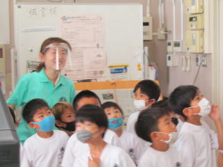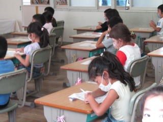 | 先生たちはフエイスシールドをつけ、子どもたちは机の間隔を広げて座り、落ち着いて授業に臨んでいます。 休み時間になると、運動場で思いっきり身体を動かす子どもたち。みんな元気に笑顔で活動しています。 |