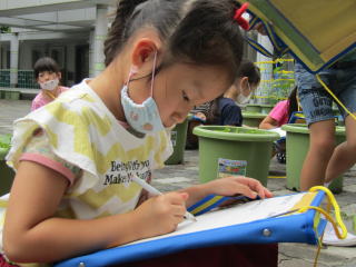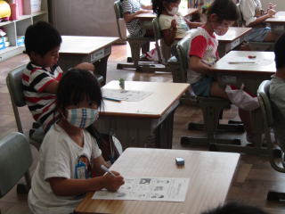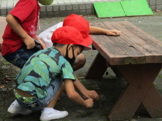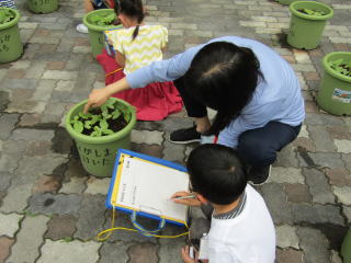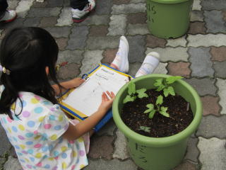 | 少しずつ葉っぱが増えてきたアサガオの苗。1年生の子どもたちがは真剣な眼差しでアサガオの観察をしました。 休み時間になると、虫の観察に早変わり・・・。思い思いに観察を楽しむ子どもたちの表情が印象に残ります。 |