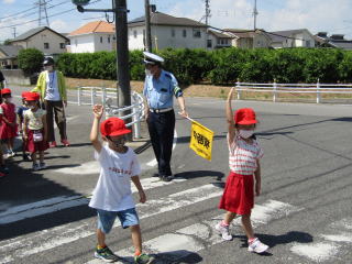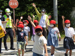 | 市の防災安全課、警察のOB、スクールガード、交通指導員の皆さまをお迎えし、学校敷地の南西部にある交差点で1年生を対象にした交通安全指導の時間がありました。 自動車の往来が激しい交差点。横断の前には、まず歩行者用の信号をよく見ること。右手を高く挙げ、右・左・右をしっかり確認してから進むことを何度もくり返し教えてもらい、横断する練習を実際に行いました。 |
