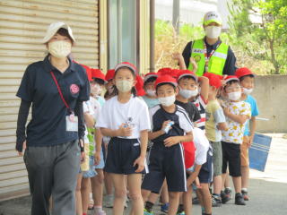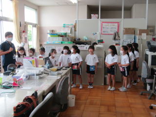 | 担任の先生に引率されて、1年生の子どもたちが学校探検をしました。職員室の中に一人ずつ大きな声であいさつをして入室する姿がありました。先生の説明にじっと聞き耳を立ててお話を聞く姿が印象に残ります。 | ![]() |