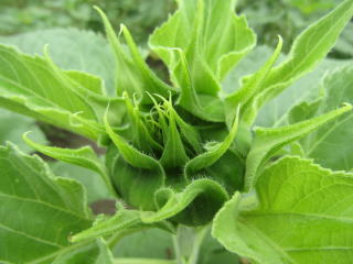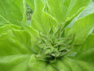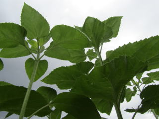 | 運動場の西側にあるヒマワリ畑。 梅雨空に負けず、天に向かって大きな葉を広げ、上へ上へと伸びています。その先端には、花のつぼみも・・・。きっと、梅雨明けの頃には大きな大輪の花をいくつも咲かせてくれることでしょう。 |