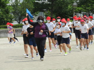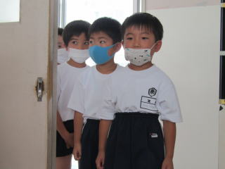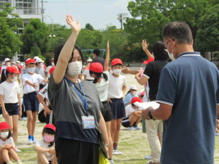 | 新たな学級になって初めてとなる避難訓練。全校が「お・は・し・も」を徹底し、安全に速やかな避難を心がけて臨みました。 第一避難場所に到着した子どもたちはいつもより隣との間隔を大きくした隊形で整列しました。 避難後、教頭先生に報告する担任の先生の大きな声にその場の空気が張り詰めました。 |