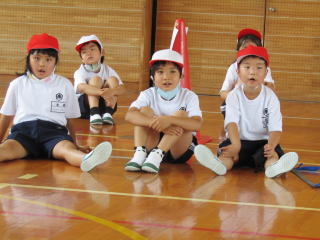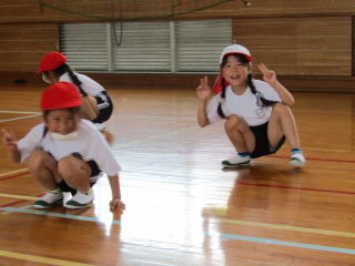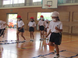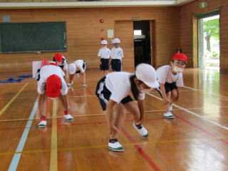 | 体育館の中では、1年生の子どもたちが元気に体を動かしています。 かにさん歩きをしたり、足首を持って歩いたり。けんけんで前へ進んだり・・・。全身で楽しみながら体つくり運動にチャレンジする姿がキラキラしていました。 |