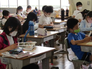 | 朝の読書の時間。校舎の中は静寂に包まれます。戻りつつある学校生活の中で、担任の先生と子どもたちが個別に教育相談を進めています。事前にアンケートを実施し、そのアンケートを元に面談をします。担任の先生が、子どもたちの不安や心配事を親身になって受け止めようとする姿に、子どもたちは安心しています。 5年生のろうかにはメダカの卵を観察するための顕微鏡が常時セットされています。 |