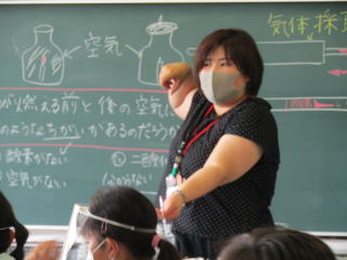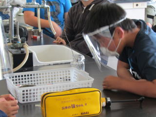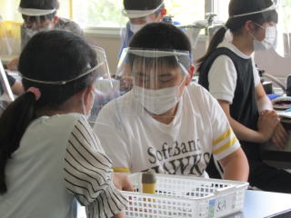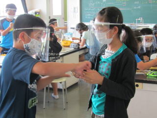 | フエイスシールドを活用する6年生の子どもたち。理科の授業での1コマです。 実験だけでなく、話し合い活動にもフエイスシールドを活用して進めています。新たな学校生活が浸透し始めています。 |