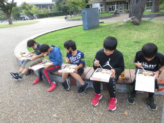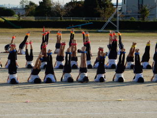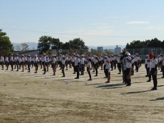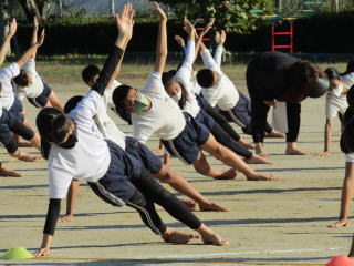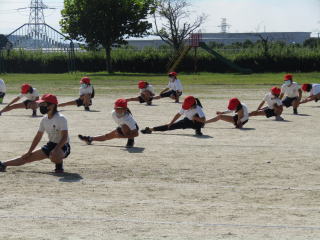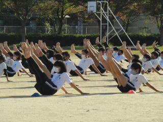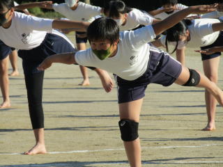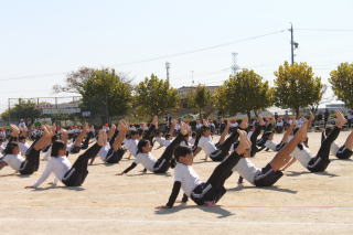 | 真っ青な秋空の下、高学年が運動場で運動会で披露する組体操(一人技)の練習をスタート。子どもたちは、一糸乱れぬ動きを目指して、練習に取り組んでいます。 | ![]() |