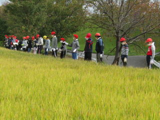 | 学校の北側の田で、5年生の子どもたちは稲刈り体験をしました。 最初に鎌の持ち方や稲の刈り方の説明があり、その後、横一列に広がって一斉に稲刈り体験。金色の稲穂がたわわに実った稲穂の束を刈り取ると、子どもたちは満面の笑みを浮かべていました。 |