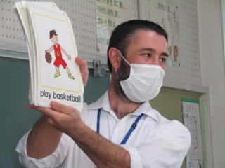 | 本日の5時間目、5年生で外国語の研究授業を行いました。単元は「友達を紹介するクイズを作ろう」。 楽しみながら「can」の使い方に慣れ親しむことをねらいとして、絵本の朗読を聞いたり、ペアでボードゲームを行ったりして、何度もくり返し「can」を発音する時間となりました。次時以降から3ヒントクイズを作ることになっています。クイズに入れる質問で「can」をどのように使ったらいいのかという感覚が身につく学習となりました。 |