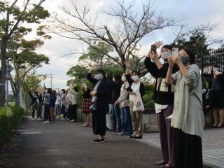 | 朝早くから正門をくぐる6年生の子どもたち。今日から待ちに待った修学旅行です。全員の子どもたちが集合時間前に集まりました。校長先生へ決意の言葉を伝え、教頭先生や保護者の皆さんへ元気よく「行ってきます!」とあいさつ。 たくさんの保護者に見送られる中、笑顔で予定通りの時間に京都へ向けて出発しました。 |