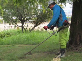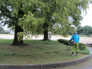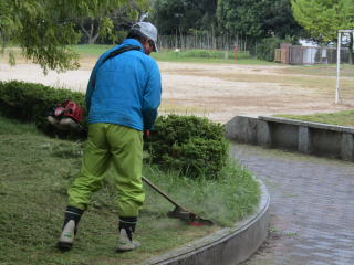 | 運動会を1週間後に控えた運動場。地域にお住まいの加藤さんが運動場と校舎の間にある植え込み周辺の草刈り作業をボランテイアでしてくださりました。 雨の中であるにもかかわらず、短時間に広大なエリアを一気にきれいにしていただきました。感謝の思いでいっぱいです。 |