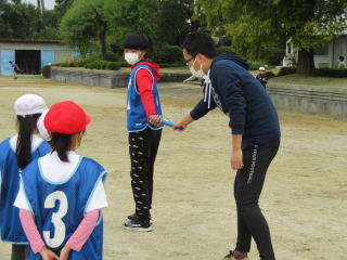 | 休み時間を利用して、リレーの練習にも取り組んでいます。 各学年から選抜された赤白対抗リレーのメンバーが運動場に集まり、先生から具体的なバトンパスの方法についてレクチャーを受けます。その後、チームごとに分かれて、早速、バトンパスの練習を繰り返しました。いよいよ来週が本番です。スムーズなバトンパスでチームの勝利を目指します。 |