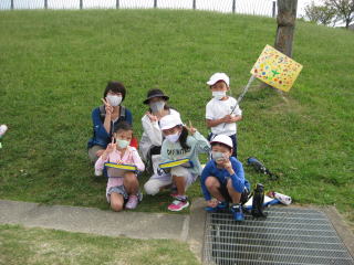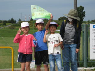 | 待ちに待った、町たんけんの日がやってきました。オリジナルの旗を掲げて、いざ、出発! お家の人に見守られながら、学区を探検して、新たな発見もいっぱいでした。 |