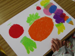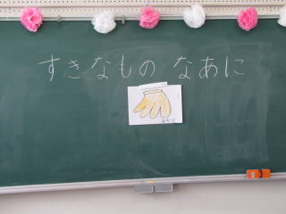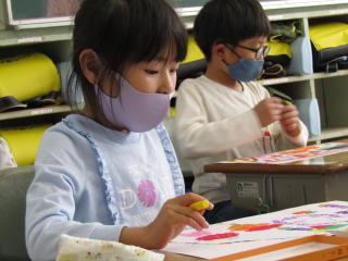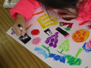 | 1年生の子どもたちが、はりきって授業に臨んでいます。クレヨンを手に持ち、真っ白な画用紙いっぱいに描きます。描いているのは「すきなもの なあに」。頭の中で膨らんだ好きなもののイメージを笑顔で思い思いに描きました。 |