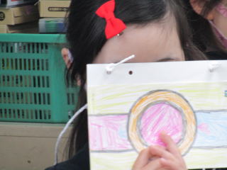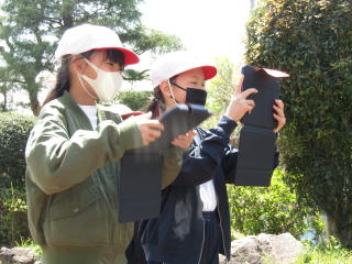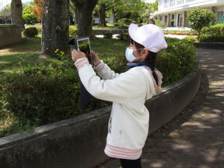 足元にはかわいい黄色の花をつけたタンポポが、目の前を真っ白な蝶々が・・・。思い思いにタブレットの画面を春へ向けます。暖かな日差しの中、子どもたちの目はキラキラと輝いていました。 |