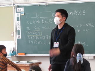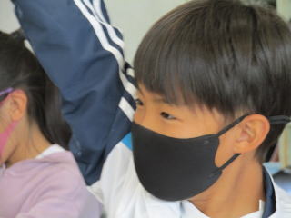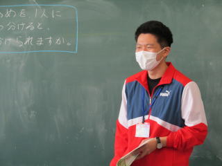 | 3年生の算数科の授業の1コマです。単元は「わり算」。子どもたちは、先生からの発問に真剣に耳を傾け、考えます。自分の考えをノートにまとめ、進んでまわりへ伝えようとします。和やかな中にも話を聴く時、考える時、書く時、説明する時のメリハリがしっかりした授業が展開されています。 |