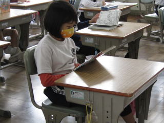 1年生の子どもたちが「学校探検」をしました。お手製のオリジナルカメラを首からかけて、笑顔で一人ずつ職員室に入ってきました。見るもの、聞くもの初めてのものばかり。オリジナルカメラでたくさんの写真を撮る姿が、とても微笑ましくうつりました。職員室を探検した後は、そのまま校長室へ。