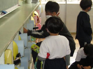 | 6年生の子どもたちは、登校後、1年生の教室へ向かいます。1年生の子どもたちが、ランドセルの中の教科書やノートを机の中に入れたり、水筒を決められた場所へ置いたり、上着をたたんでロッカーへ入れたり・・・まだまだ慣れないことを朝の読書までの時間を使ってお手伝いしています。1年生の目線に合わせて、しゃがみ、優しく語りかける姿に6年生としての自覚の高まりを感じ、とても頼もしく見えます。 |