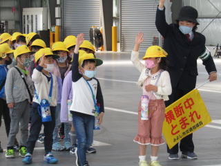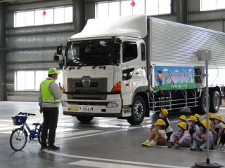 始めに道路でのきまりの話を聴いた後、屋内訓練センターへ。そこでは、大型トラックを実際に走らせて後輪の内輪差に潜む危険性について目の当たりにしました。次に2つのグループに分かれての活動です。一方はトラックの運転席に一人ずつ入り、運転席からの死角について知りました。もう一方のグループは模擬信号を使って、横断歩道を渡る練習です。子どもたちは、指導員からの話をよく聴き、注意深く安全に気をつけて横断歩道を渡ることができました。
