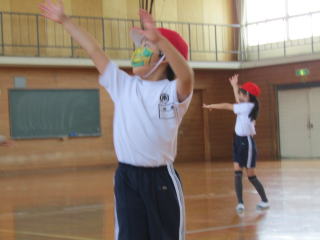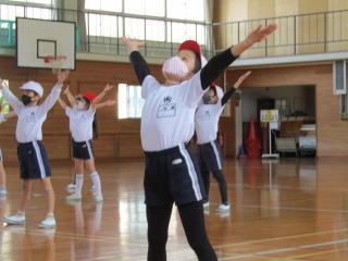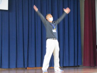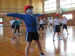 | 2年生の子どもたちが体育館に集まり、体育科の授業です。前後左右の間隔を十分にあけてラジオ体操に取り組みました。ステージの上には体育科のスペシャリストであり、授業アドバイザーの田畑先生。先生のアドバイスの一言一言を真剣に聴き、忠実に全身を動かす子どもたち。しだいに指先までが伸び、大きく伸びやかなラジオ体操ができるようになりました。 |