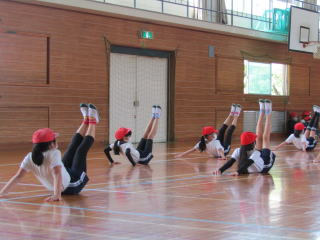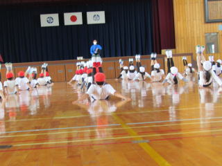 5年生の子どもたちが体育館で組体操の練習です。運動会へ向けて、本格的な練習が始まりました。