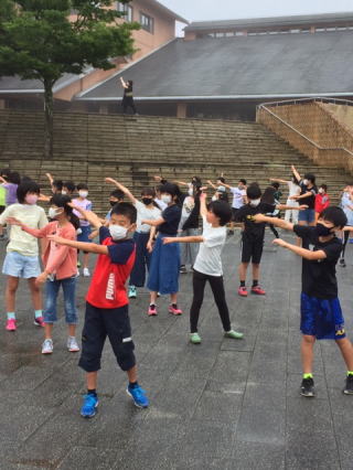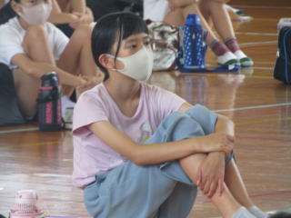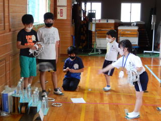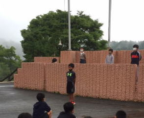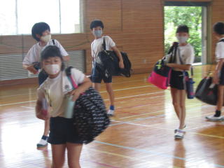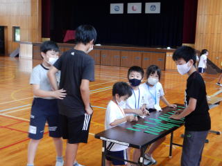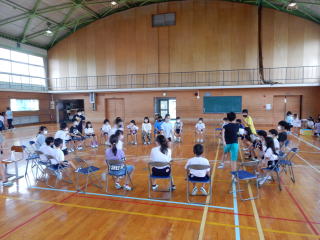 雨は降っていませんが、昨晩の激しい雨のため、ウォークラリーは、やむなく断念します。自然環境には、逆らえません。それを受け入れることも野外学習で学ぶことの一つですね。 その代わり、体育館で楽しくレクリエーションを行います。 |