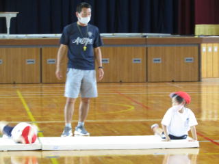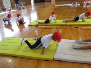 アシカをマネして前へ進んだり、丸太のように横へ転がったり、後ろ転がりに挑戦したり・・・。子どもたちは、真剣な表情で運動に臨んでいました。