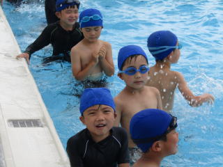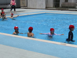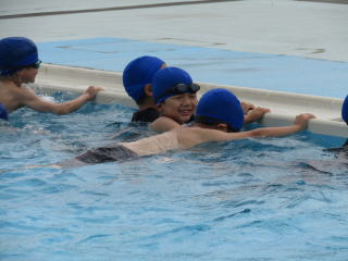| 梅雨明けして、夏本番となりました。真っ青な夏空の下、今日も1年生の子どもたちは元気にプールサイドに集まりました。しっかりと準備運動をした後はバディを確認。静かに入水して歩きます。男女に分かれて、「大の字浮き」にチャレンジ。始めの頃は、顔を水につけることすら怖がっていた子どもたちの多くが、今ではふんわりと水に体をあずけて上手に浮くことまでできるようになりました。 |