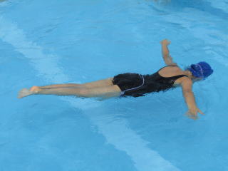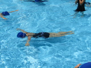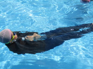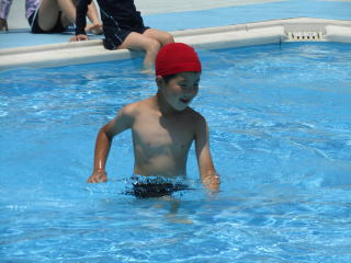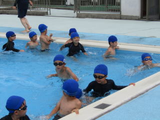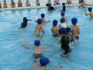 その後、バディを確認し、ゆっくり水の中へ入ります。水の中を歩いて、走って、ジャンプして、水に浮いて・・・生き生きと動き回る子どもたち。そして、最後には、「大の字浮き」。顔を水につけたまま、ゆっくりと体を水にあずけると、ふわりと浮くようになりました。 |
