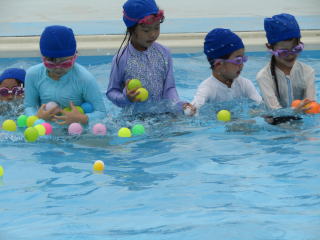 その後、ゆっくり水の中へ入ります。水面に浮かぶカラフルなボールを夢中になって集めます。十分に水に慣れたところで、だるま浮きにチャレンジ。体の力を抜くと、上手にふわりと浮きました。 |