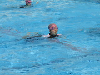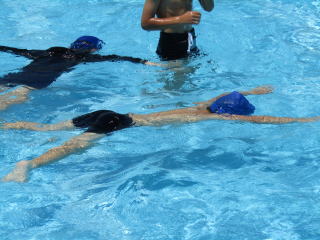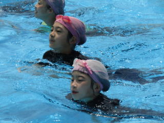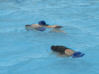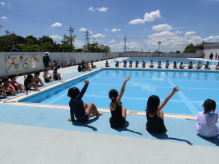 しっかりと準備運動をした後は、ソーシャルデイスタンスを保ったまま水に入り、クロールと平泳ぎの練習を繰り返し練習します。